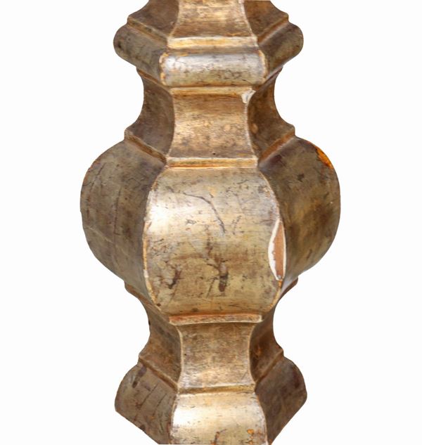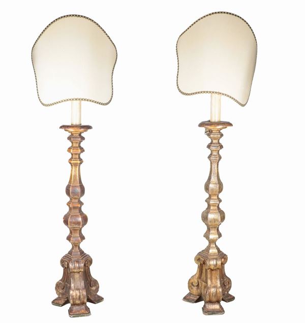 Pair of large antique Louis XIV floor torch holders in silvered, gilded and carved wood, reduced to electric light