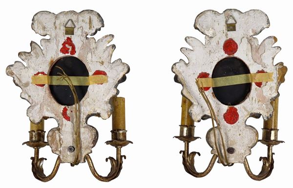 Pair of small ancient gilded and silvered wooden appliques in Mecca with carvings of acanthus leaves, oval mercury mirrors in the centre, 2 [..]