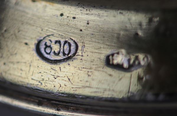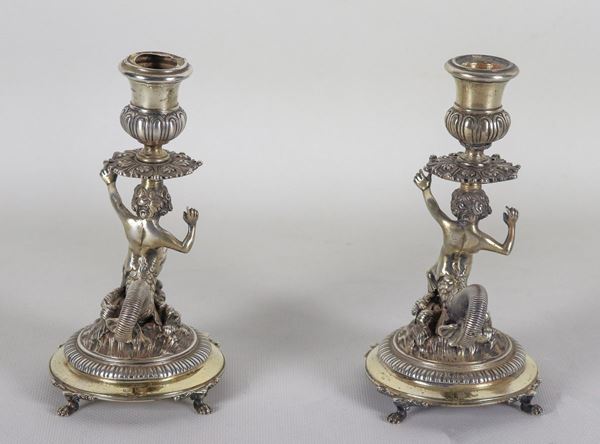 Pair of small candlesticks in chiselled and embossed silver with sculptures of Tritons and shells, gr. 930