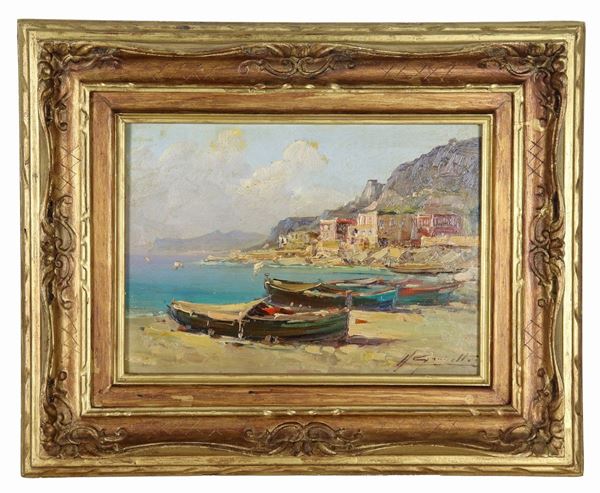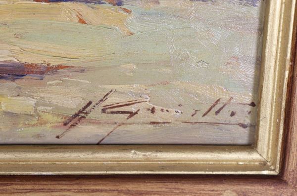 Signed. "Fishermen's houses with marina and boats", small oil painting on plywood