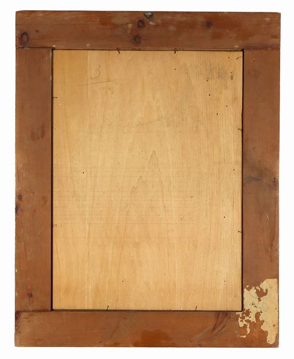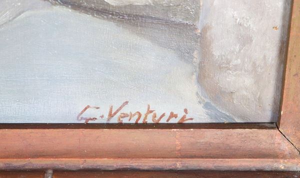 Signed. "Glimpse of a mountain village with flowered balconies and fountain", oil painting on plywood