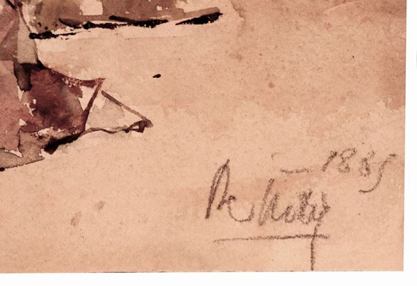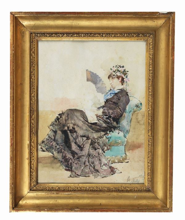 Signed and dated 1883. “Young girl in an armchair”, fine watercolor on paper