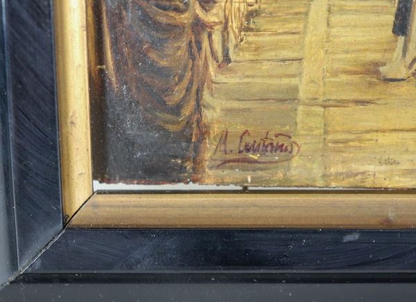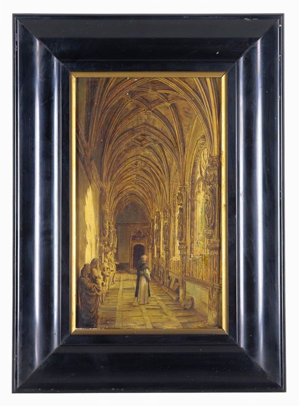 Signed. “Interior of Spanish cathedral with friar", small oil painting on panel