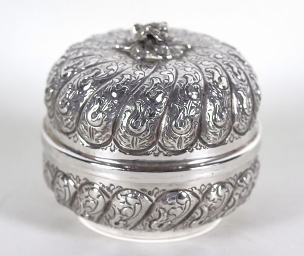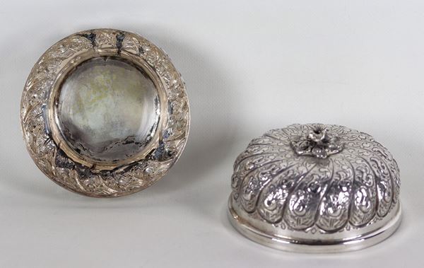 Round oriental box in chiselled and embossed silver with flower and leaf motifs, inside has some stains, gr. 440