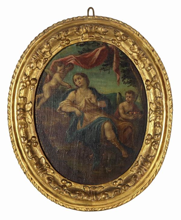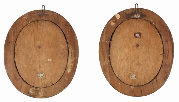 "The Goddess of Spring and the Goddess of Summer with cherubs", pair of small oval oil paintings on canvas applied to the table