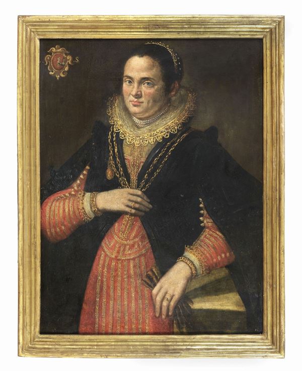 "Portrait of a noblewoman with jewels and coat of arms", oil painting on canvas