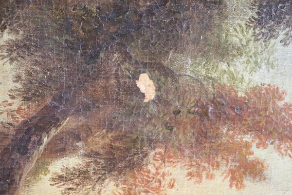 "Landscape with marina, boats, fishermen and village", oil painting on canvas