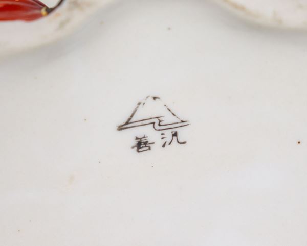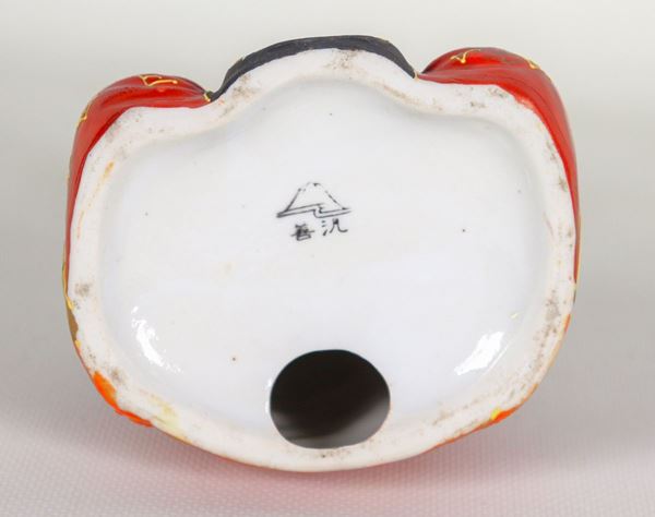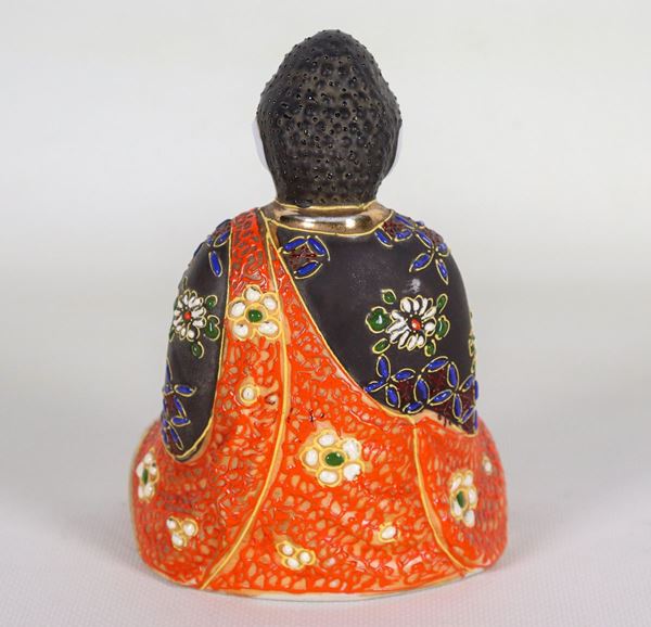 Small oriental sculpture "Buddha" in porcelain, with relief enamel decorations with floral motifs