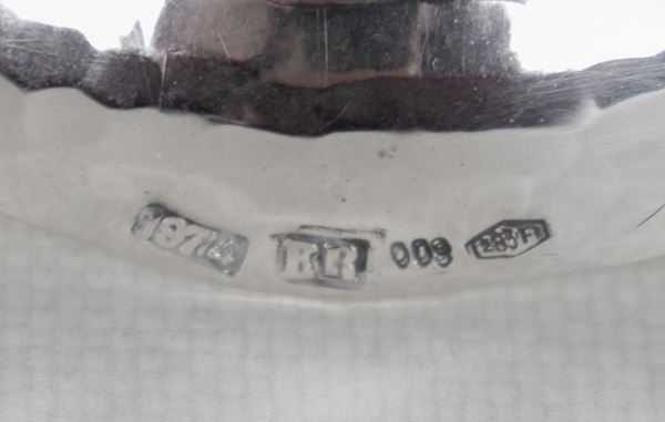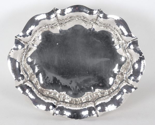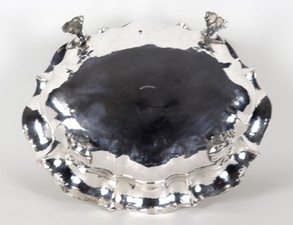 Small oval silver centerpiece with curved edge, supported by four lion feet, gr. 460