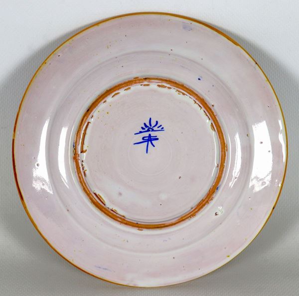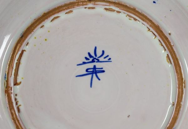 Small plate in Gualdo Tadino glazed majolica marked Alfredo Santarelli (1874-1957), entirely colorful with motifs of leaves and a central four-leaf [..]