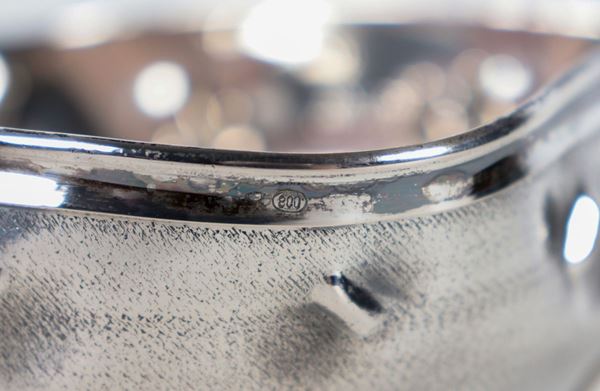 Square bowl in chiselled and embossed silver, supported by four shell-shaped feet, gr. 200