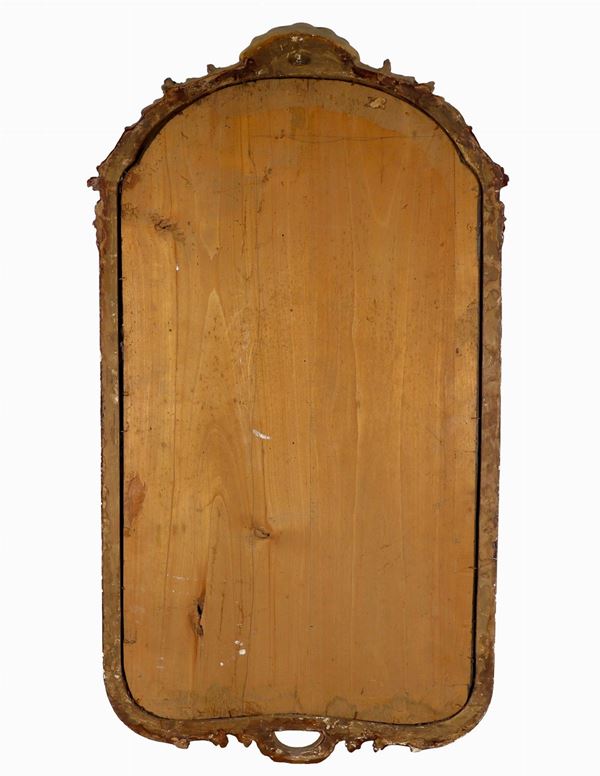 Venetian mirror in gilded and carved wood, with a small shell-shaped cymatium and mercury glass engraved with the figure of Hercules. Mercury [..]