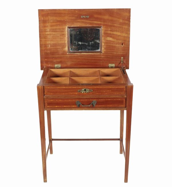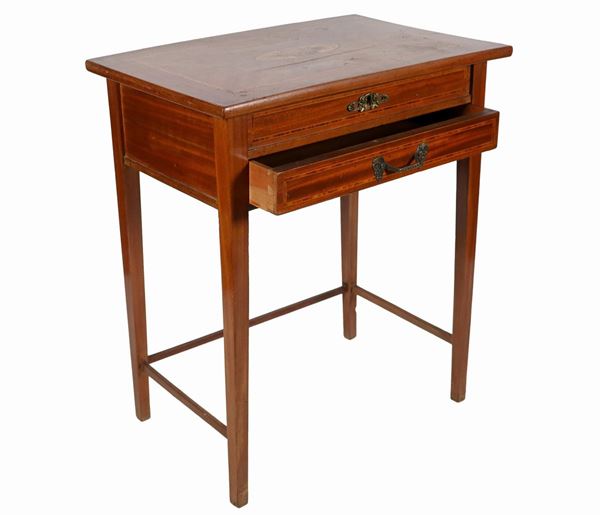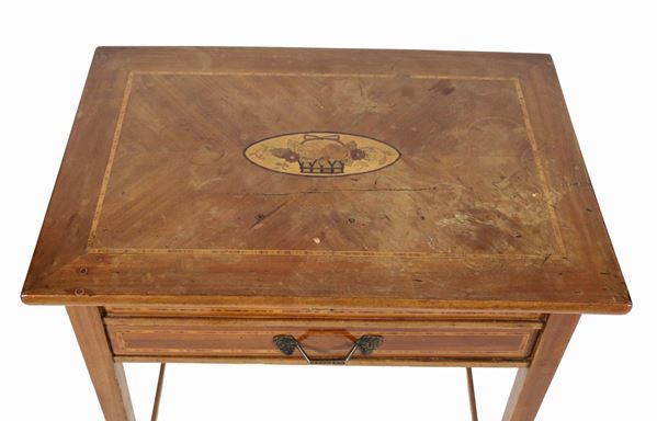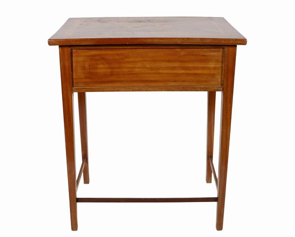 Work table in mahogany and bois de rose, with geometric thread inlays and medallion on the top with basket of flowers inside. Folding top with [..]