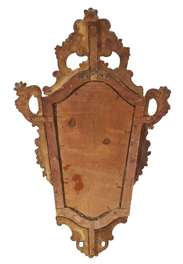 Ancient small Venetian fan mirror, in gilded wood and carved with Louis XV motifs, mercury mirror