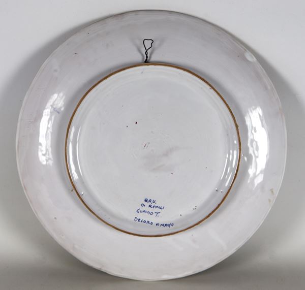 Large Gualdo Tadino glazed majolica parade plate, decorated in the center with a portrait of a sixteenth-century noblewoman. 1930s-40s