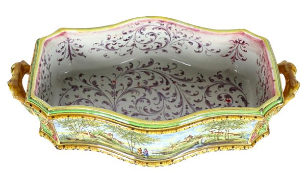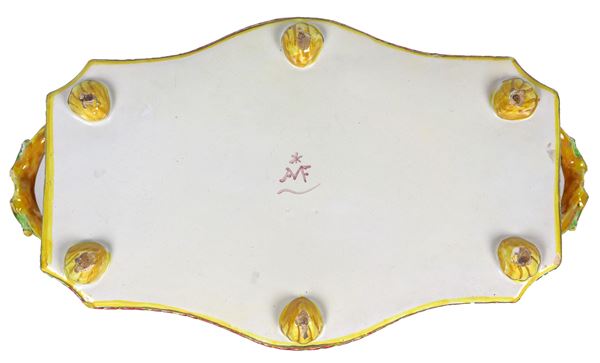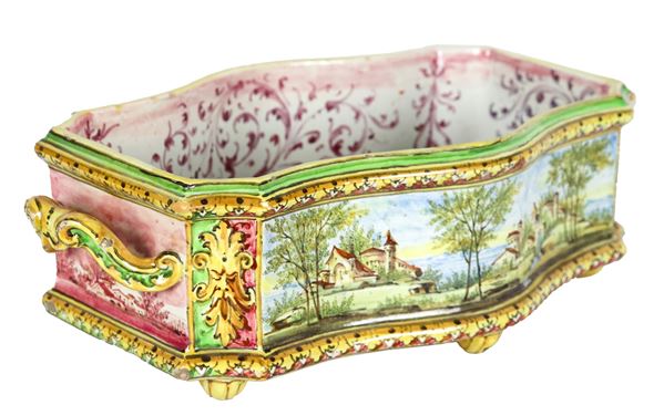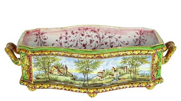 Ancient centerpiece in polychrome Bolognese majolica, with a curved rectangular shape with two handles, entirely decorated with landscape motifs. [..]