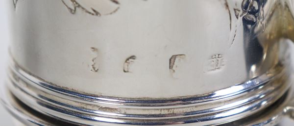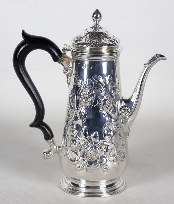 Ancient English chocolate pot in chiseled and embossed silver with floral scrolls, ebonized wooden handle, gr. 710