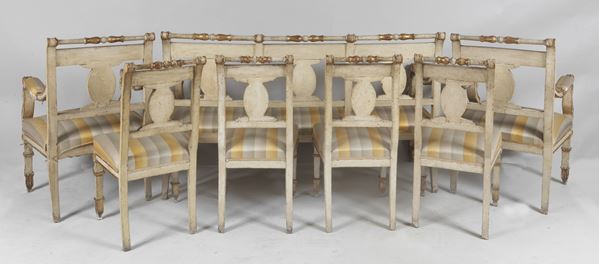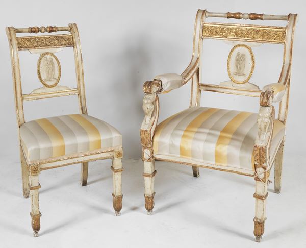 Ancient First Empire lounge in gilded and ivory lacquered wood, with backrests with oval medallions with mythological figures and upper band [..]