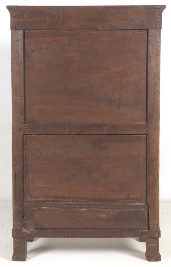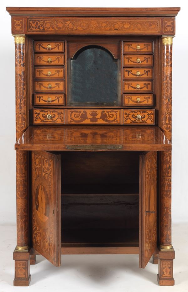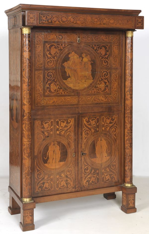 Ancient Lombard walnut secretaire, First Empire period, entirely inlaid with neoclassical motifs with acanthus leaf scrolls, threads and medallions [..]