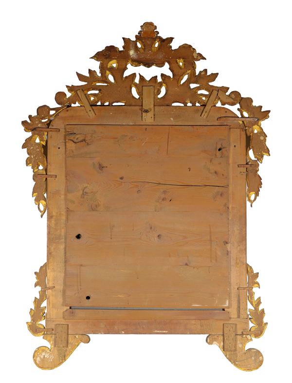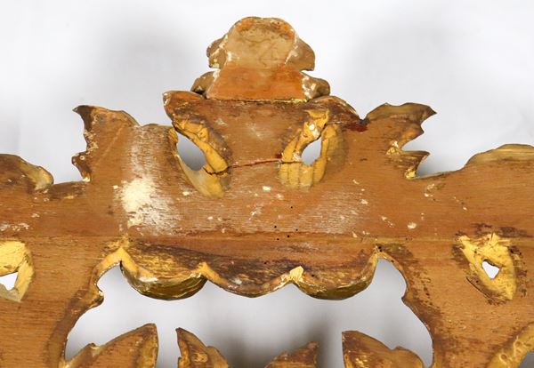 Ancient Neapolitan mirror in gilded wood and carved with scrolls, curls and cascades of flowers, mercury mirror. Some shortcomings