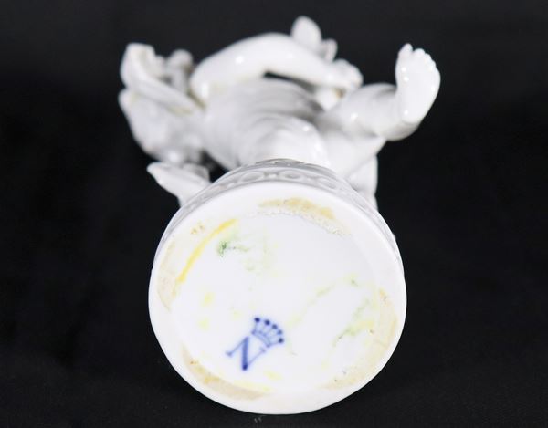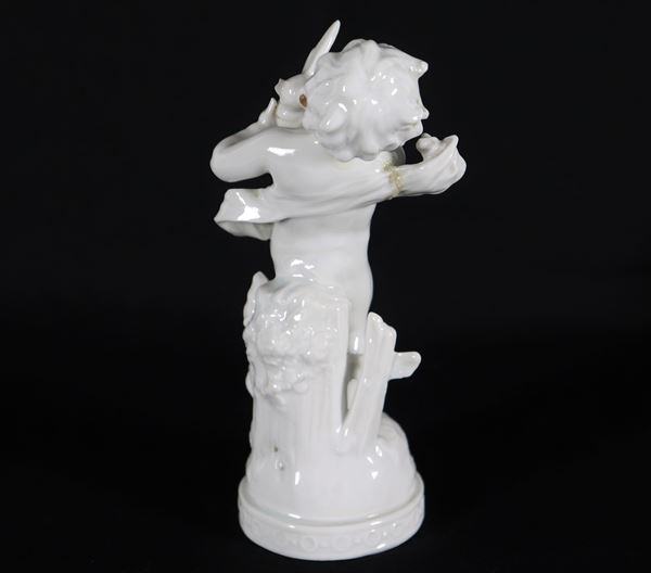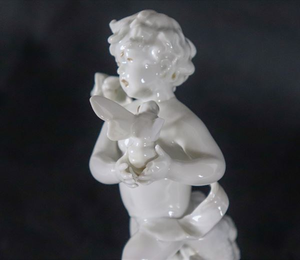 Ancient "Puttino with bee" figurine in white enamelled porcelain from Capodimonte, various missing parts