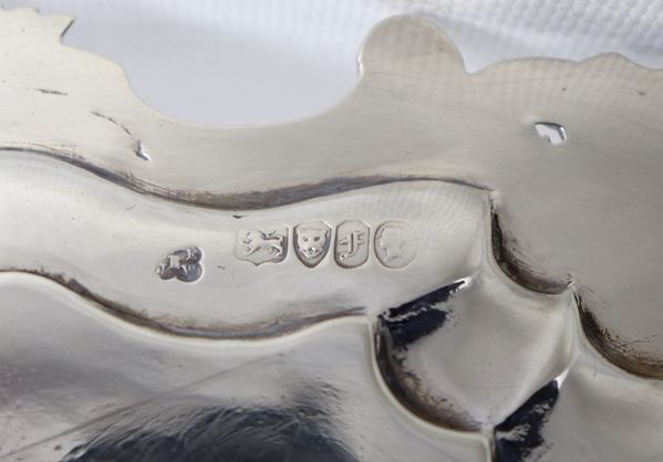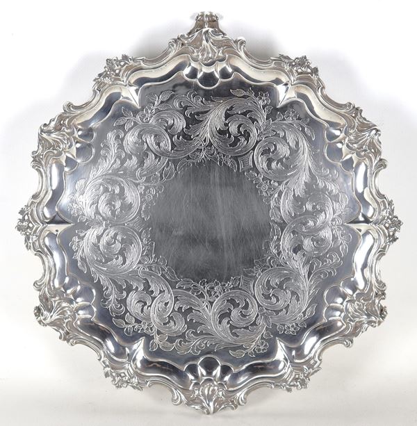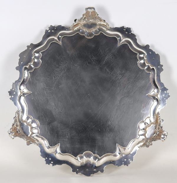 Ancient silver salver from the Queen Victoria era, entirely chiseled and embossed with scrolls, flowers and shells, curved edge and three curved [..]