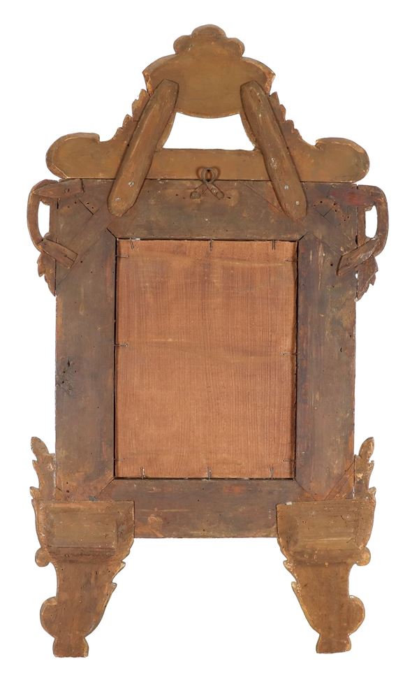 Ancient small mirror from the Marche region, in gilded wood carved with Louis XV motifs of curls, cords and vegetal motifs, shaped cymatium [..]