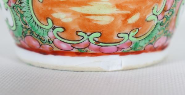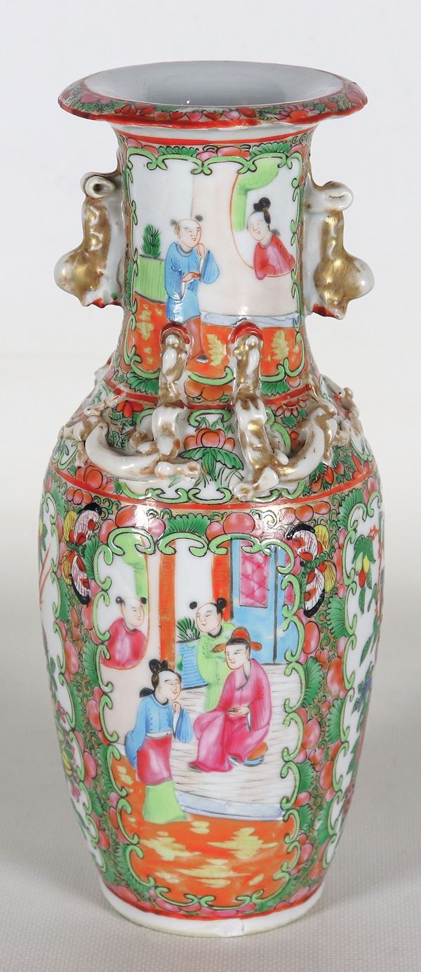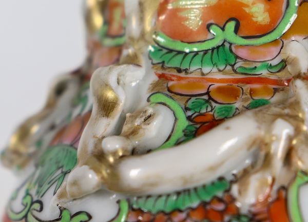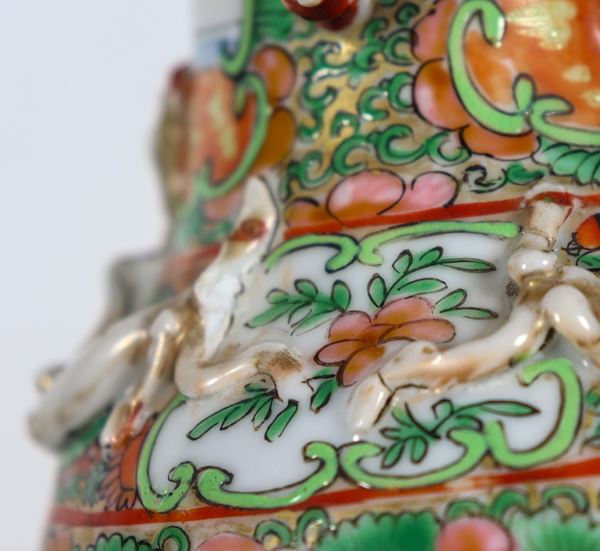 Antique Chinese vase in Canton porcelain, with relief enamel decorations of oriental life scenes, flowers and parrots. Slight defects and slight [..]