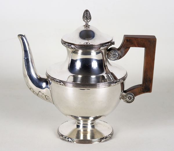 Antique chiseled and embossed silver coffee pot with Empire motifs, wooden handle, gr. 680