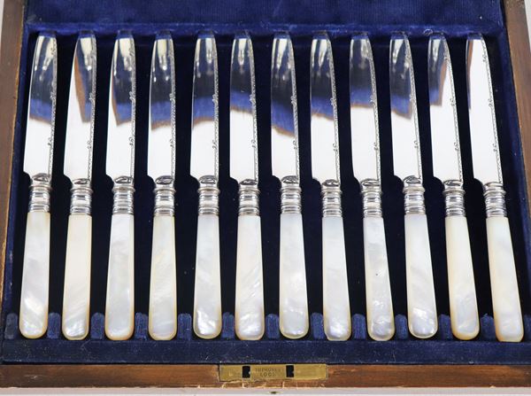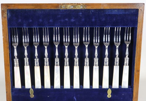 Antique English dessert cutlery set, in chiselled Sheffield with mother-of-pearl handles, original mahogany case (24 pieces)