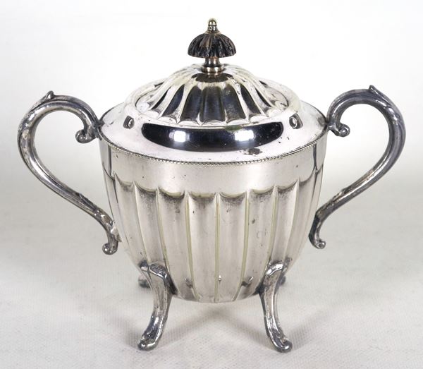 Antique English sugar bowl in chiselled and embossed Sheffield, two handles and four curved feet