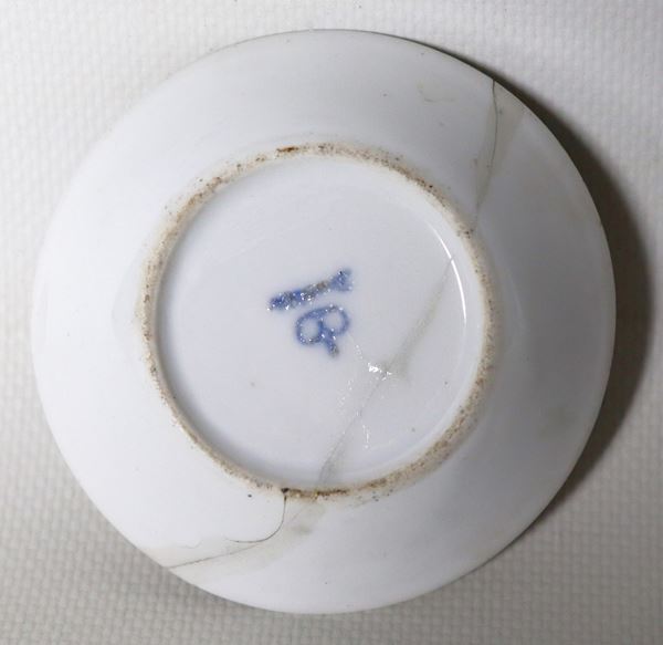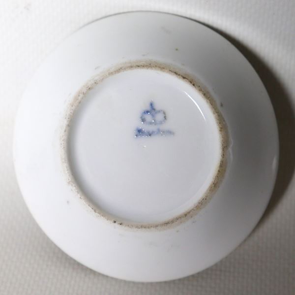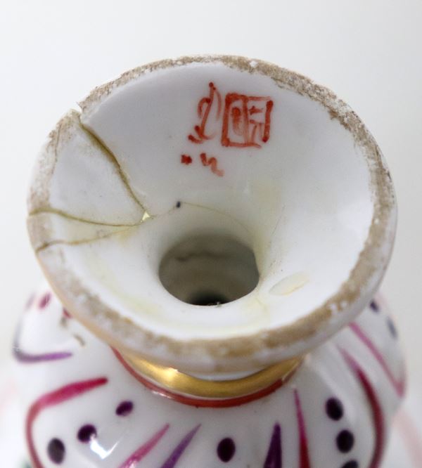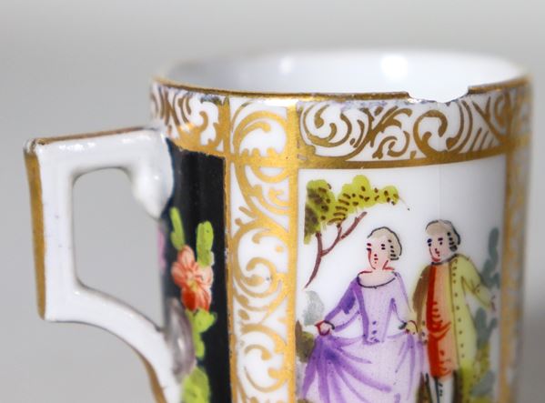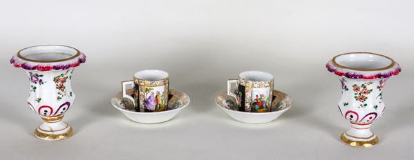 Antique lot in Dresden and French polychrome porcelain of a pair of cups with saucers and a pair of amphora jars (4 pieces), various breakage [..]