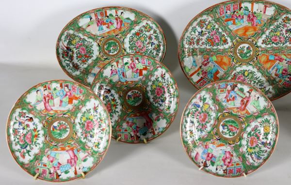 Antique lot of ten Chinese Canton porcelain wall plates, with polychrome enamel decorations in relief of scenes of oriental life, floral and [..]
