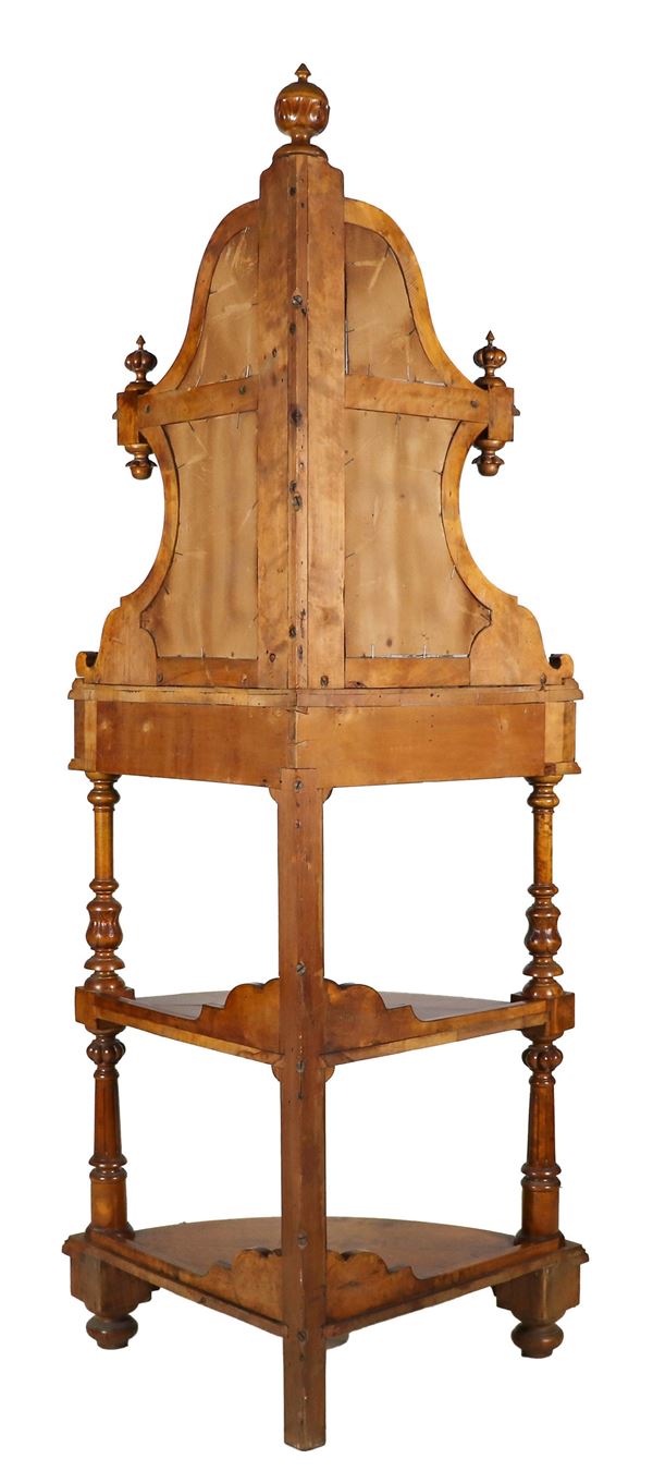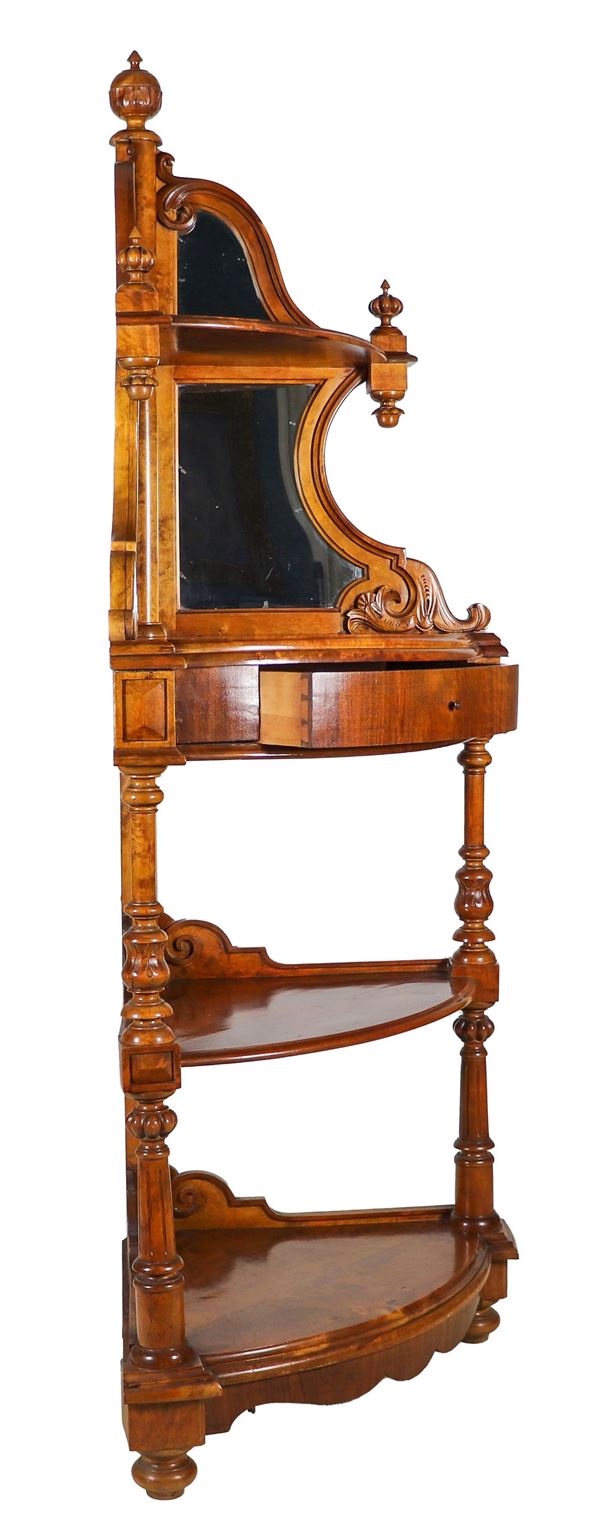 Antique Louis Philippe corner cupboard in carved walnut, with raised top in a shaped shape with mirrors, a central drawer, three shelves and [..]