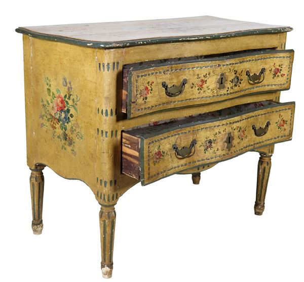 Antique Marche chest of drawers from the Louis XV line, in ivory lacquered wood with painted decorations with floral motifs, two drawers and [..]