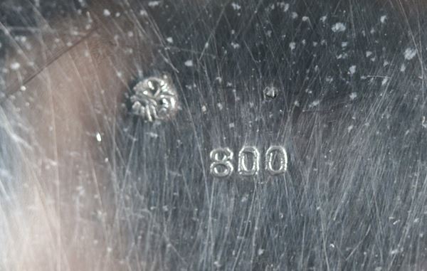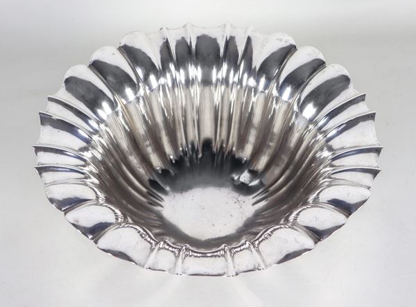 Antique round silver centerpiece with scalloped and podled edge, supported by four ball feet, gr. 750