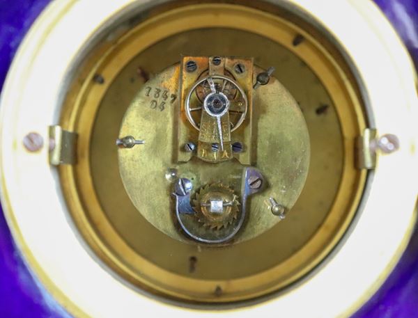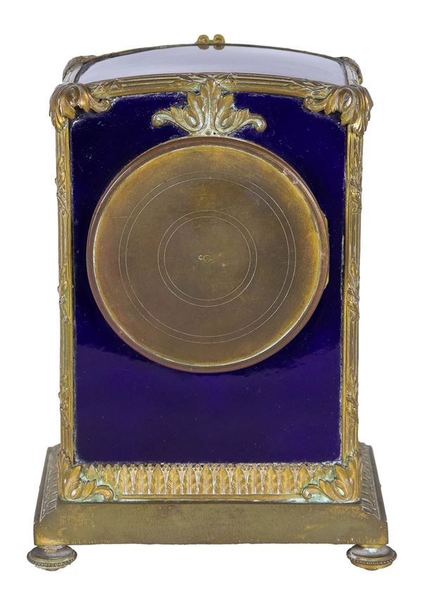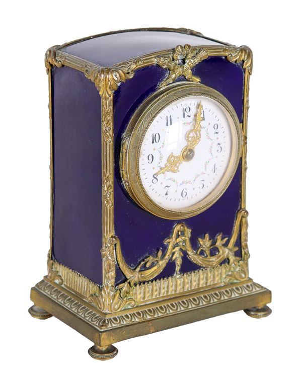 Antique small French table clock in ceramic covered in blue enamel, with gilded and chiseled bronze trimmings and friezes, white enamel dial [..]