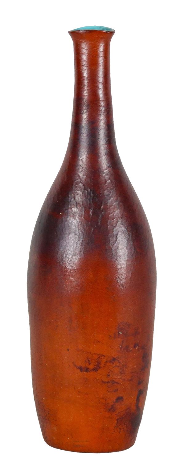 Bottle covered in leather with an oval plaque in the center in polychrome enamel representing an abstract female figure. 50s - 60s