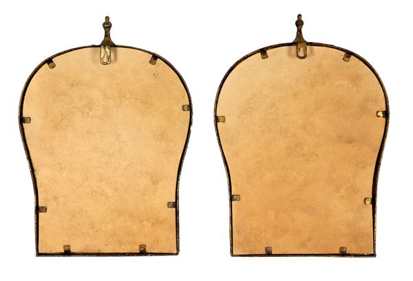 "Cages with parrots", pair of small wall models in golden metal with decorated glass