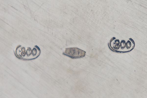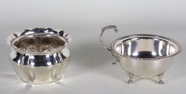 Chiseled and embossed silver lot of a cup with curved handle and a round jar with scalloped edge, gr. 270