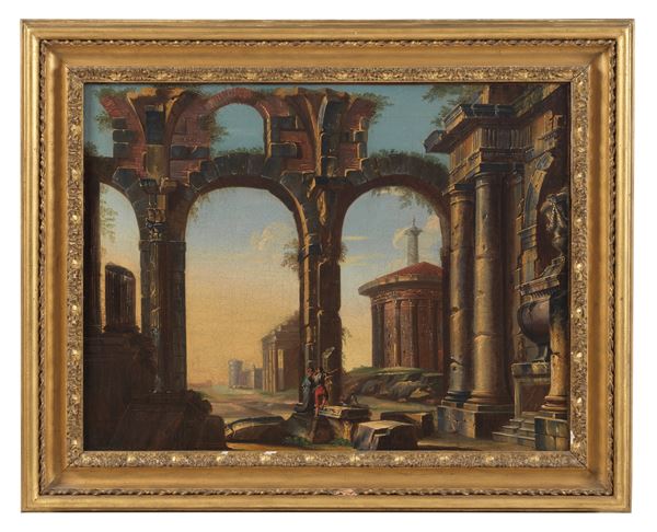 Circle of. "Architectures with ruins with characters", bright oil painting on canvas of excellent pictorial execution