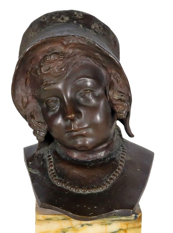 Signed. "Head of a little girl with necklace and hat", bronze bust supported by a veined marble base