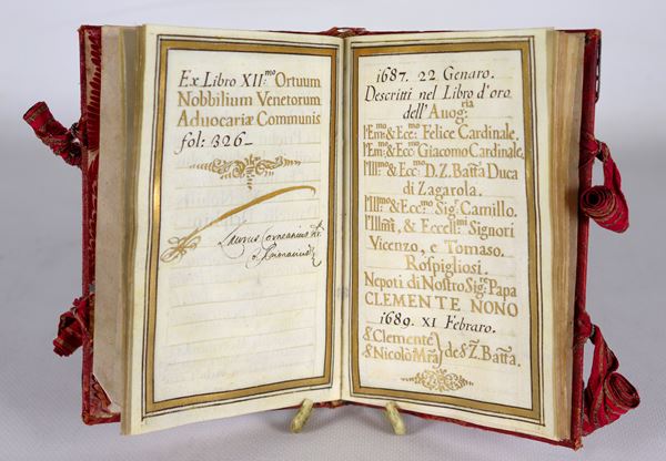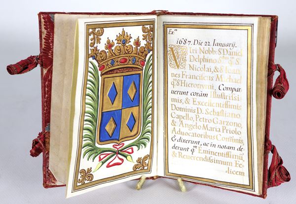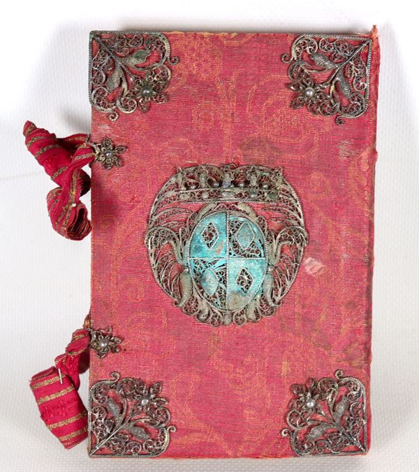 "History of the Notables of the Rospigliosi Family in the years 1680 and 1687", ancient booklet with purple-red damask fabric cover and filigree [..]