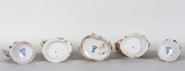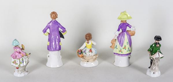 Lot of five polychrome porcelain figurines depicting ladies, knights and little girls, four forming two couples. Minor defects