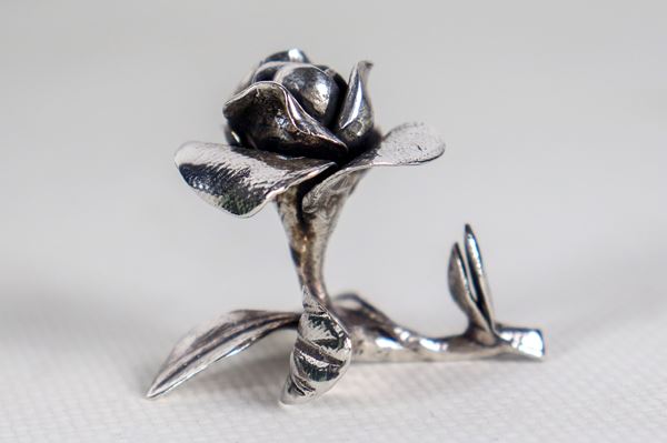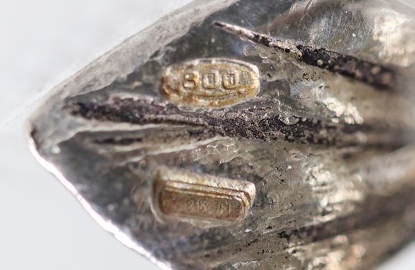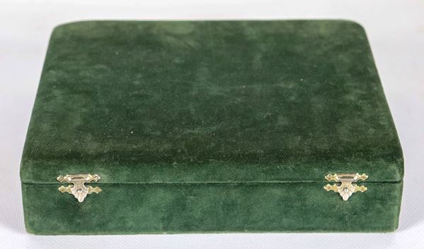 Lot of twelve placeholders in chiselled and embossed silver in the shape of flowers, green velvet case, gr. 250