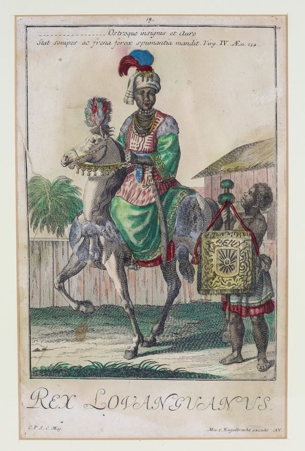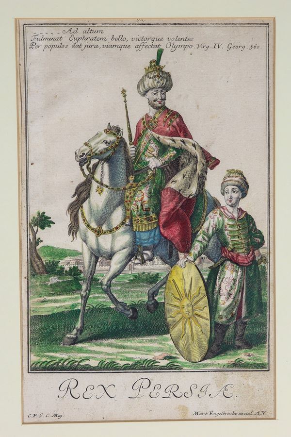 Lot of two ancient watercolor engravings on paper depicting "Royals of Asia", united in a single frame