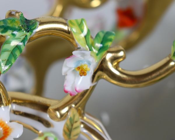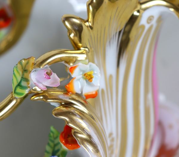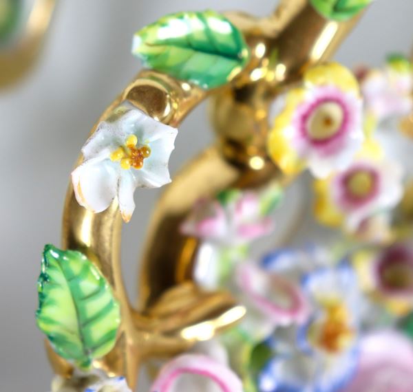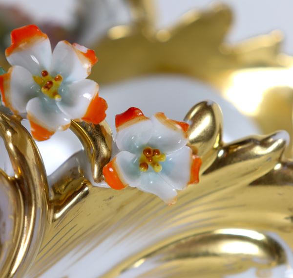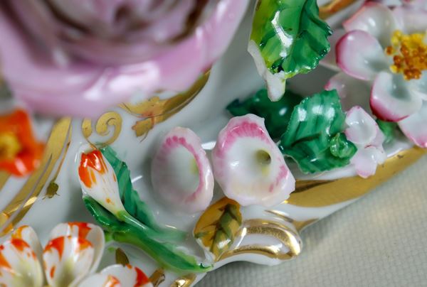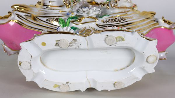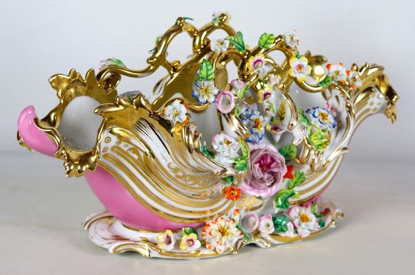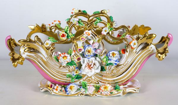 Louis Philippe centerpiece in Old Paris polychrome porcelain, in the shape of a basket, with garlands of flowers in relief and highlights in [..]