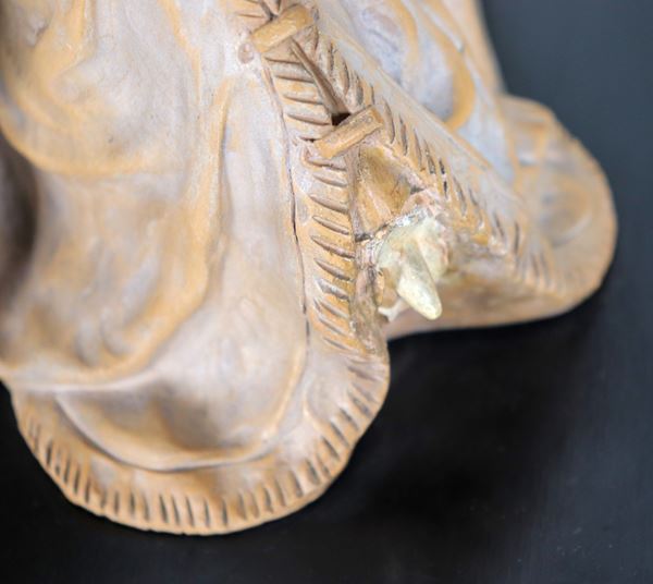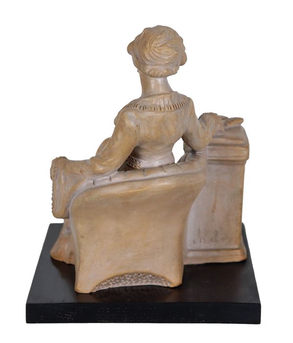 Signed. "Lady in armchair with book", patinated ceramic group, supported by a quadrangular wooden base. The lady is missing a foot