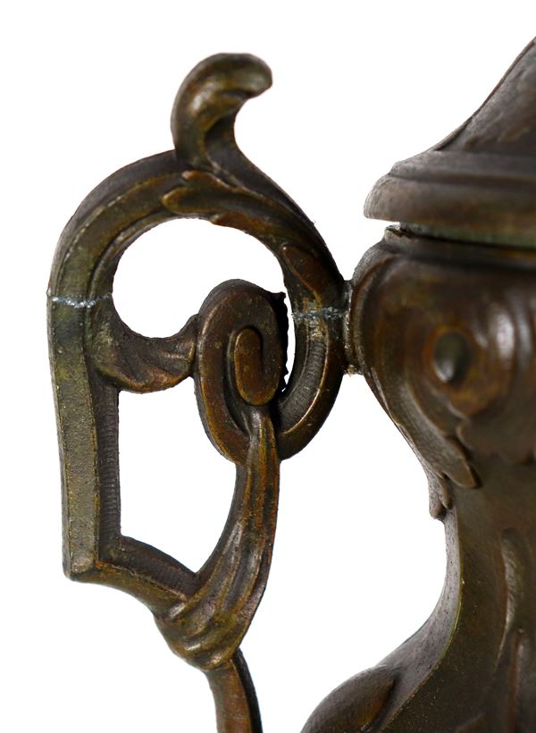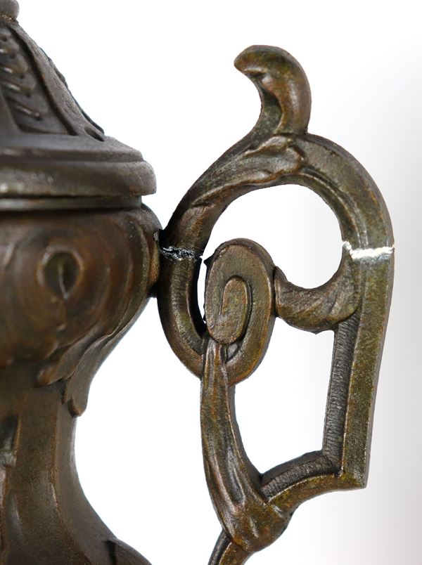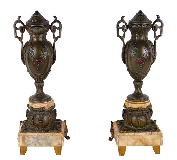 Pair of ancient French amphorae in embossed bronze with floral motifs and volutes, bases in veined pink marble. An amphora has a defective ha [..]