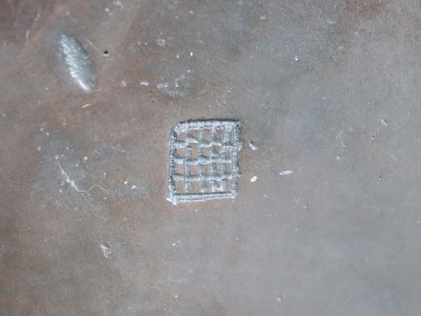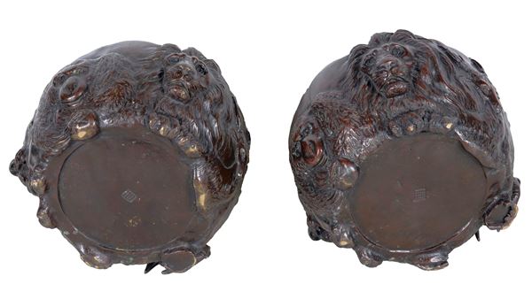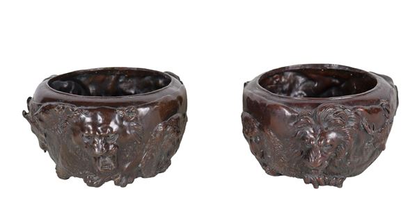 Pair of ancient oriental cachepots, in chiseled and embossed bronze in relief with animal heads, marked. Nineteenth century